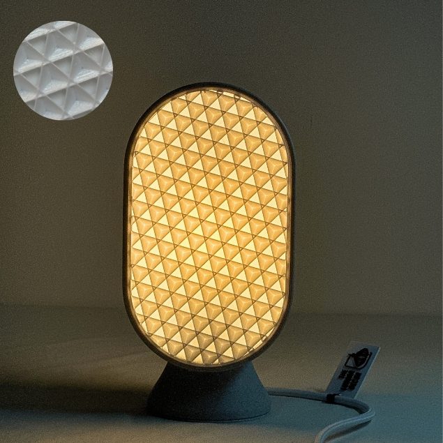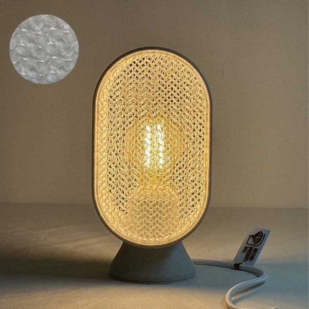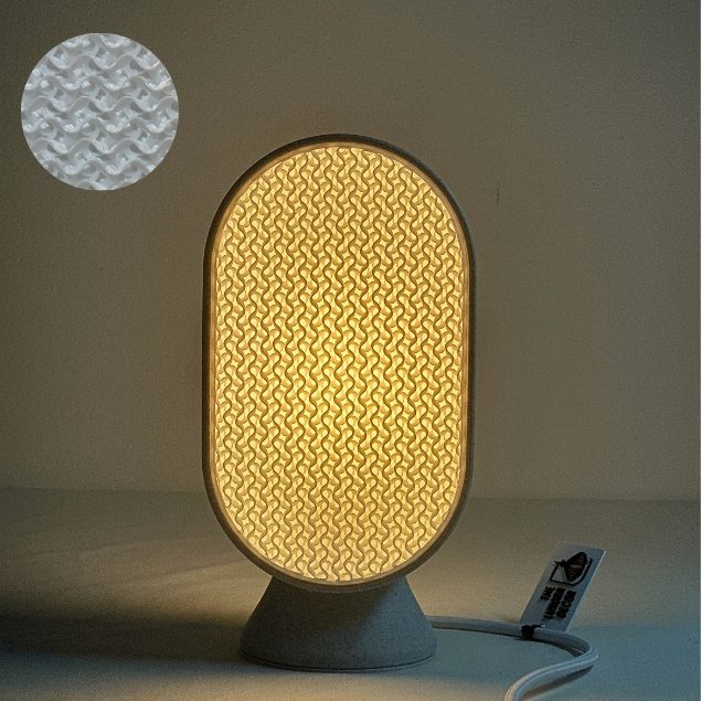 Stampata in PETG riciclato, con cavo in tessuto e luce LED calda inclusa, unisce eleganza, funzionalità e sostenibilità.